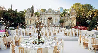 Dolmabahçe Palace is a Palace – Museum and not available for private receptions. Only high level official receptios or cocktails are held at the main palace garden or at the Medhal Hall.